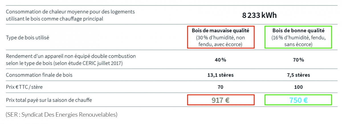 Sur un appareil récent, l’utilisation d’un bois « ordinaire » contenant environ 30% d’humidité provoque une multiplication par 8 des émissions de particules polluantes par rapport à l’utilisation d’un bois sec (<20%). Ce qui correspond à des niveaux d’émission d’un appareil d’ancienne génération. (CERIC 2017).